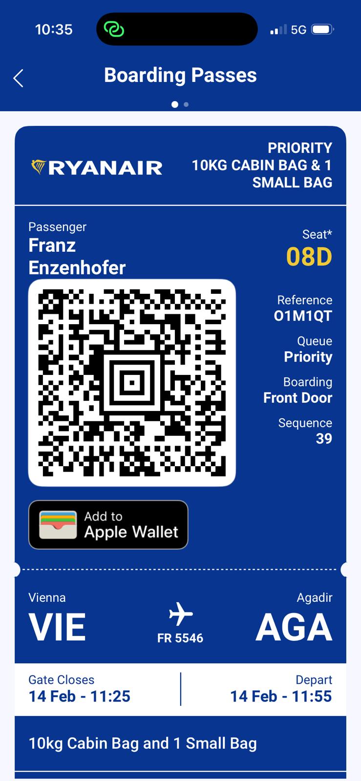 Return check-in opens Feb 20 at 15:40. At Agadir airport: show digital boarding pass at desk to get PRINTED pass before security.