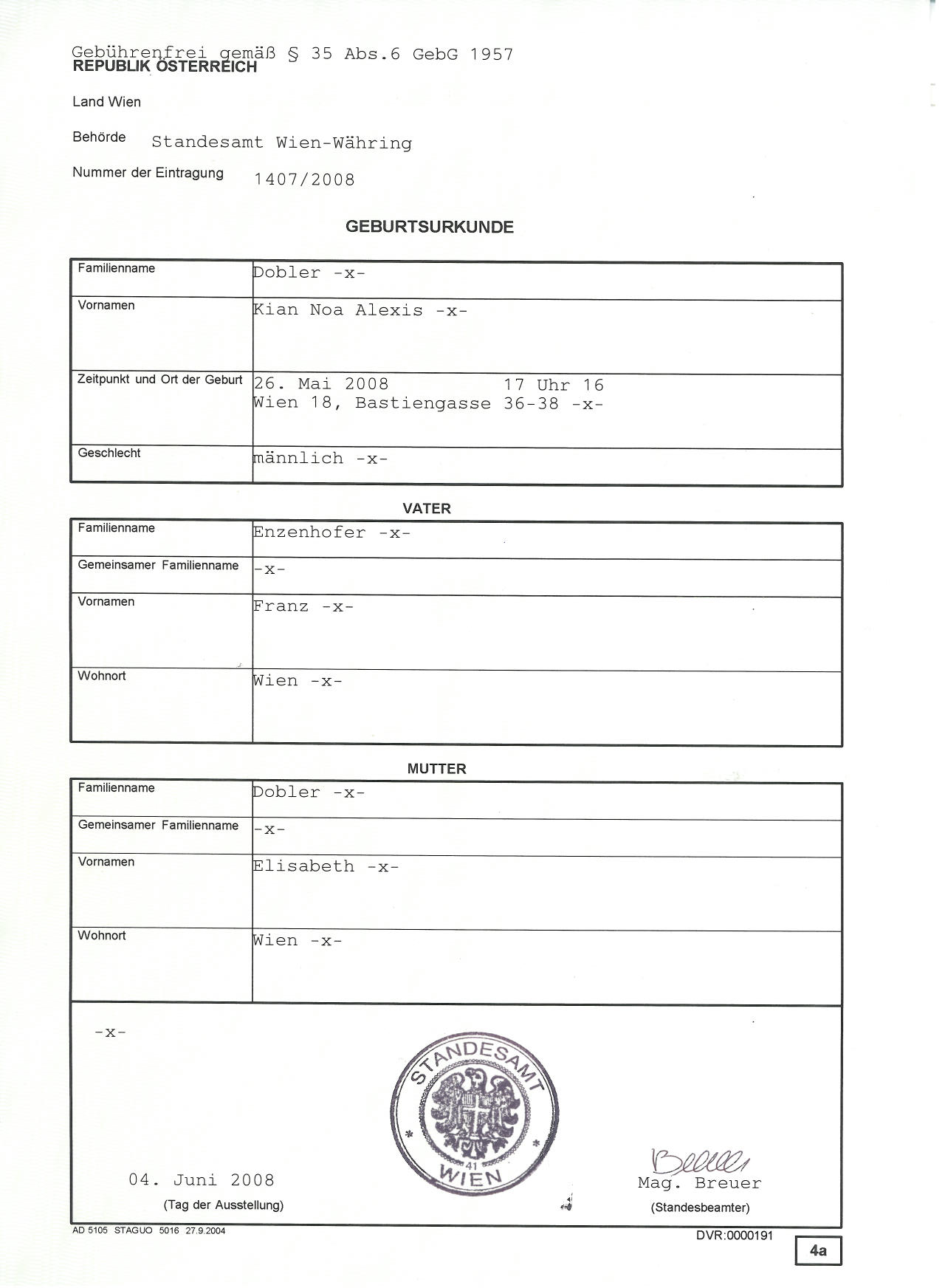 Standesamt Wien-Währing, Reg. 1407/2008